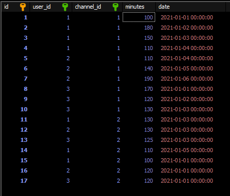 INSERT INTO watched_time (id,user_id, channel_id,minutes,`date`)