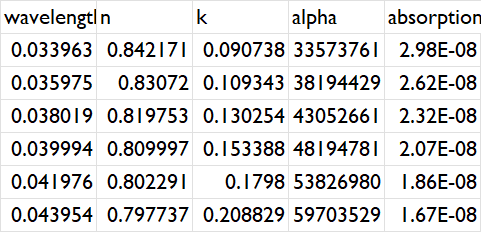 [{"wavelength": "0.033962528", "n": "0.842171", "k": "0.090738197", "alpha": ["alpha"]},