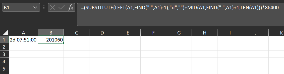 =(SUBSTITUTE(LEFT(A1,FIND(" ",A1)-1),"d","")+MID(A1,FIND(" ",A1)+1,LEN(A1)))*86400