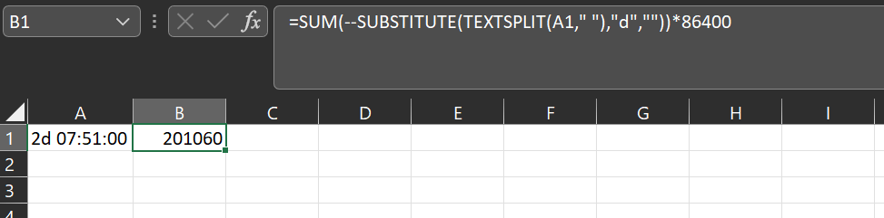 =SUM(--SUBSTITUTE(TEXTSPLIT(A1," "),"d",""))*86400
