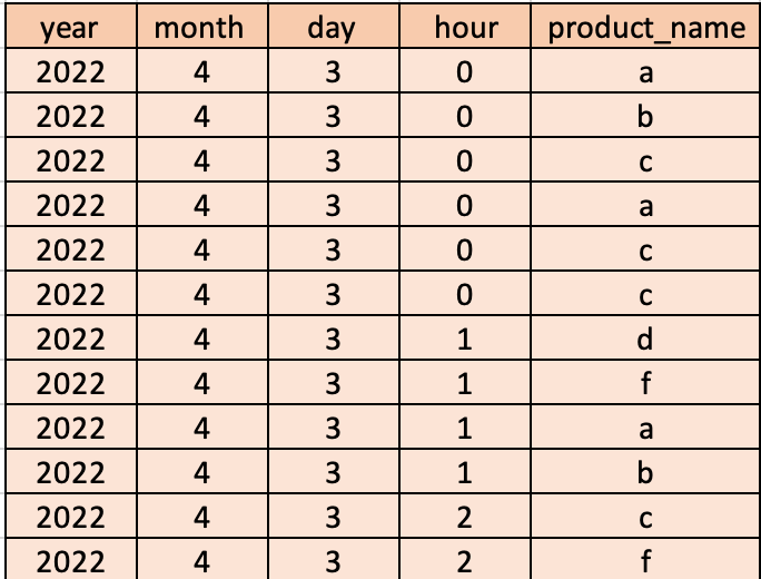 My desired output is a table where for a given time instance (a specific combination of year-month-day-hour) count of all product purchases are extended into the table as columns. "all_product_names" variable gives you a list of all the products that exist. Notice that not every time instance has all products purchased, for those instances, the "count table" value for that product must be zero. Here is what I am trying to get my output grouping to look like: