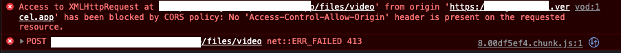 Your POST request giving you 413 HTTP error that occurs when the size of a client’s request exceeds the server’s file size limit.in your case the size of the video you want to uploded bigger than the size of the server limit