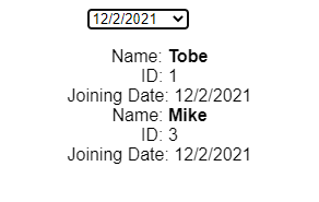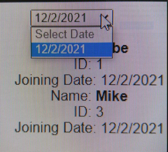 I have student data. I want to filter and display names and IDs based on date. I can select the date but once I choose a date the dropdown menu shows only that particular date, not the other dates. I want to see all the dates whenever I click the input field. Could you please guide me on what I am doing wrong in my code?