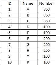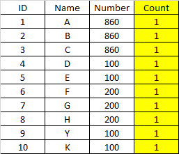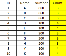 select id, name, number, count(*) over (partition by number)