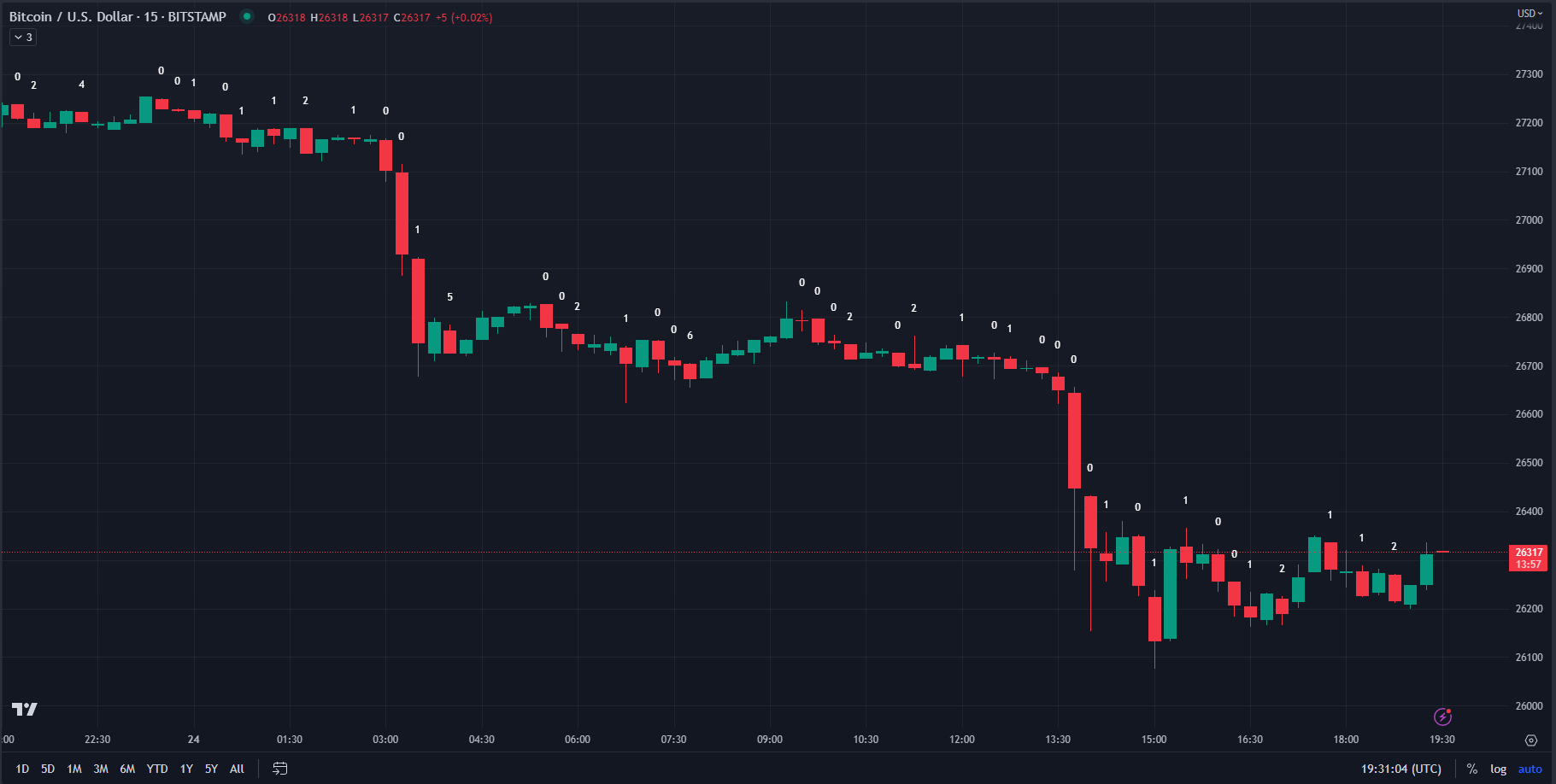 I am trying to find the number of consecutive green candles that happen after each red candle, then show that number on the top of the corresponding red candle.