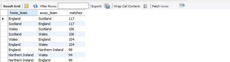select home.home_team, home.away_team, (home_matches_against+away_matches_against) as matches