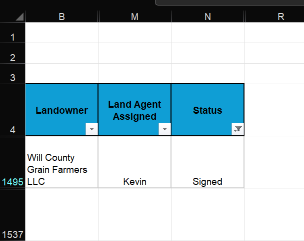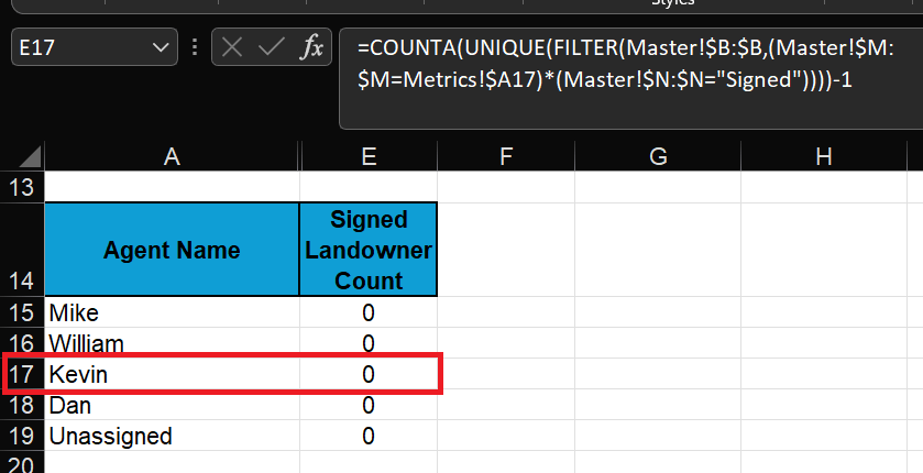I want to do a count formula to see how many unique landowners the agent has "signed". When I filter my sheet called "Master", I can see that only 1 agent has signed: