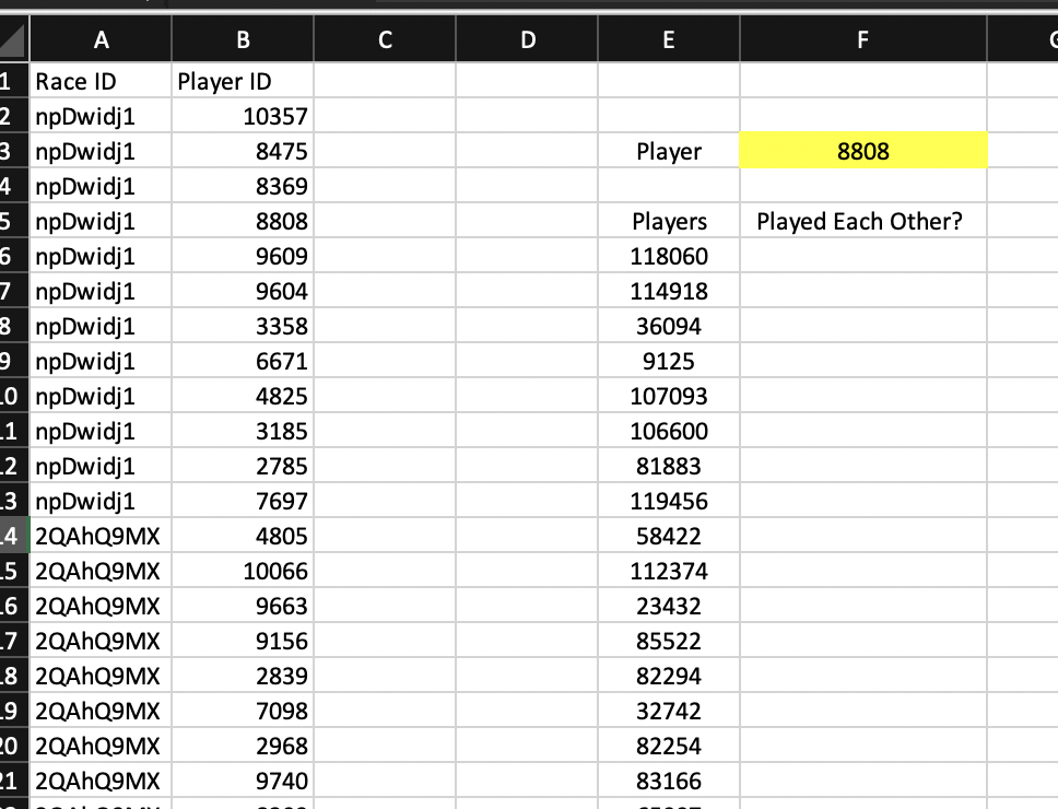 =IF(SUM(COUNTIFS(Table1[Player ID],E6,Table1[Race ID],UNIQUE(FILTER(Table1[Race ID],Table1[Player ID]=F$3)))),"Yes","No")