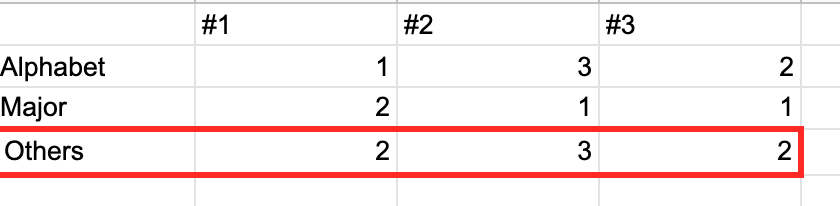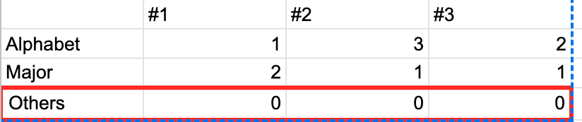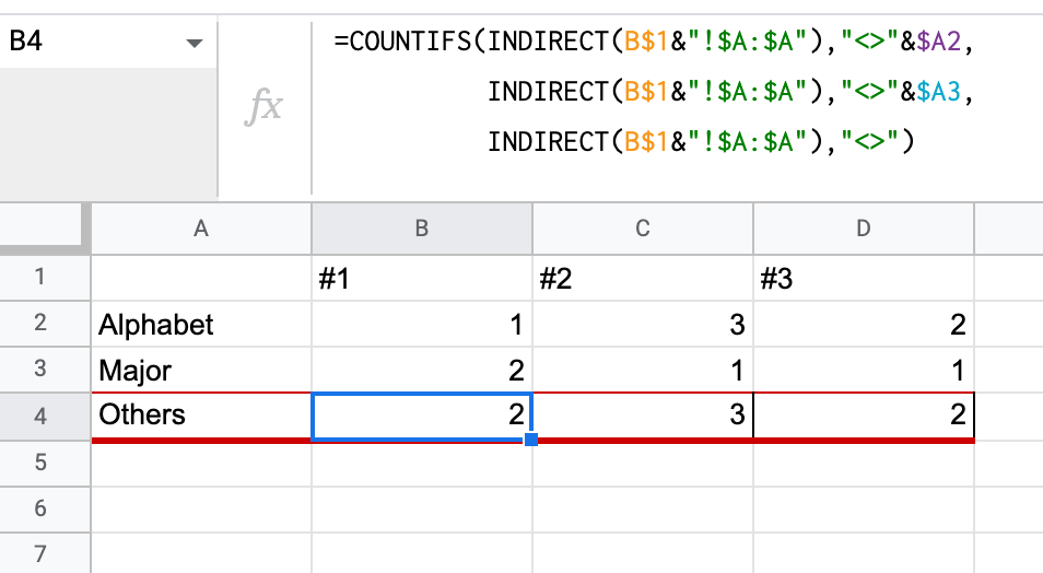 I’ve cells which has direct referring like Alphabet & Major. I’m trying to get count which are not Alphabet & Major and get the value in "other"