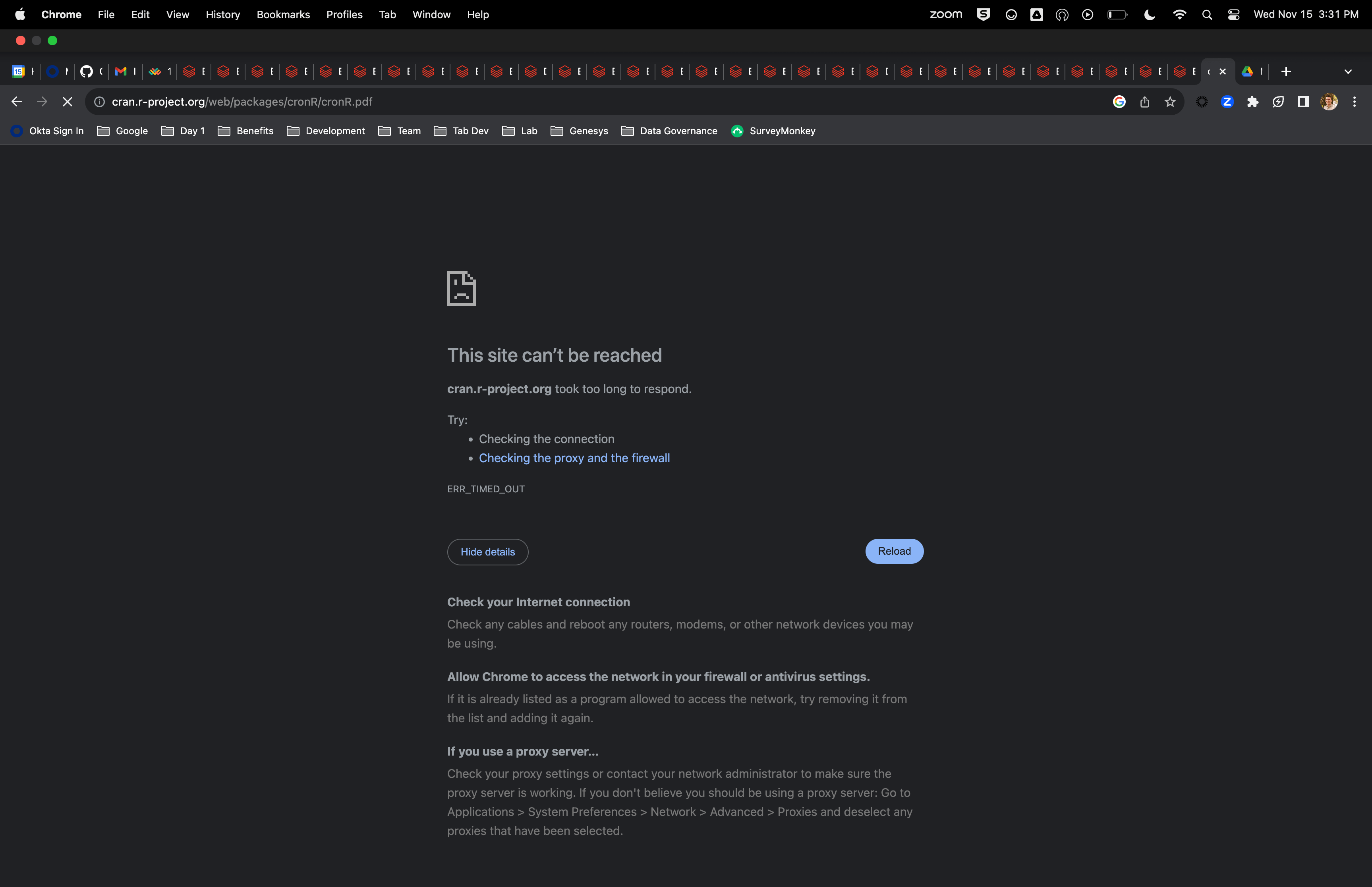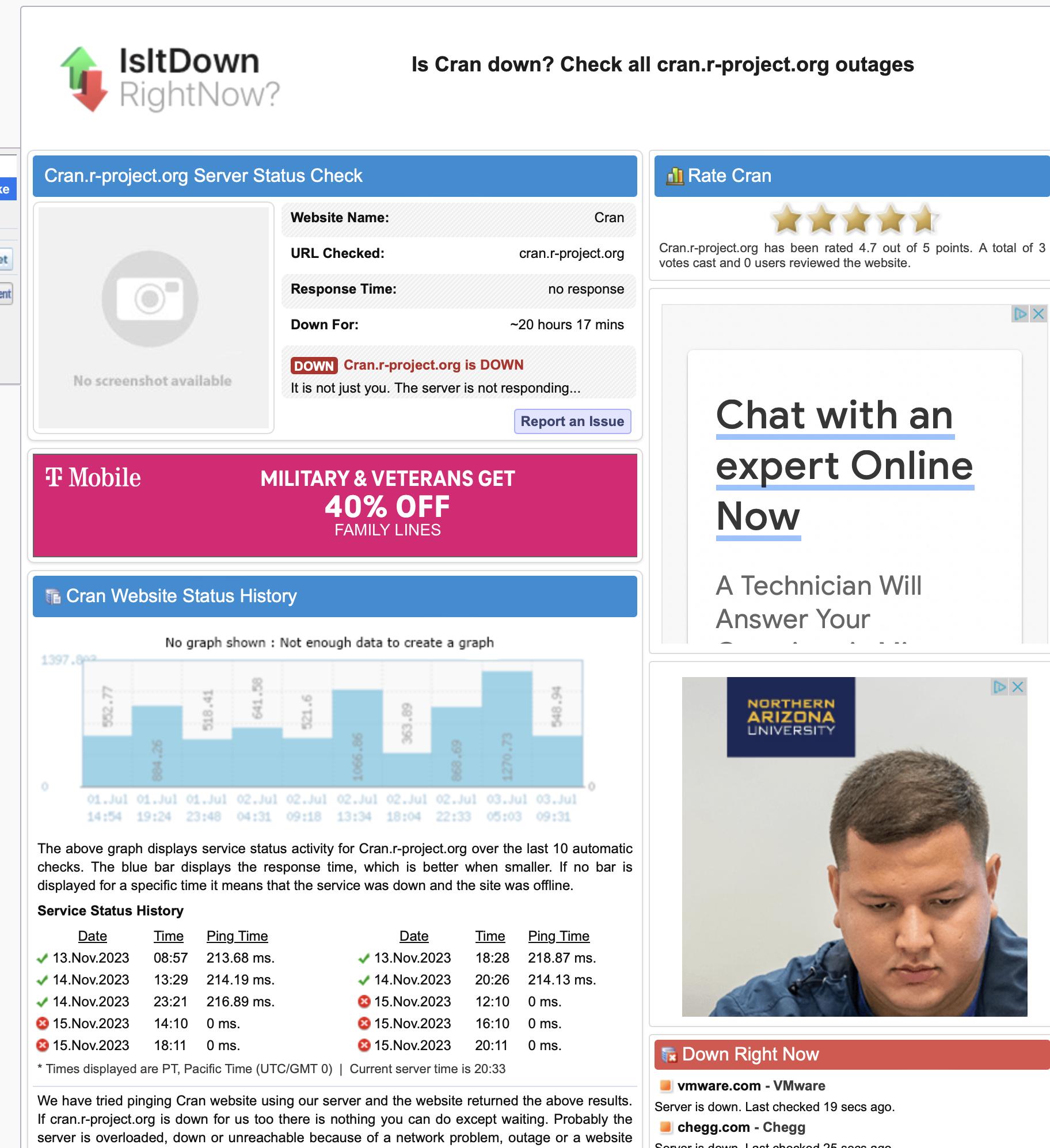 cran.r-project.org is down and it is really messing up my day. Not only has it been down today, but it has been down for over 20 hours according to this website and the screenshots below. Does anyone know what is going on or when we can expect it back up?
