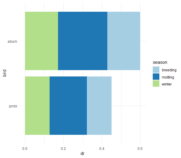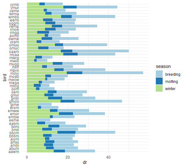 I would like all birds listed on the y axis, and I would like the x axis to be dr. I would like the bars to be colored-coded based on proportion of observations from each season. For example, for abum, I would like the bar to reach 0.6, and I would like the bar to be color-coded based on season. abum has 3/7 observations during the molting season, 2/7 during breeding, and 2/7 during winter. I would like the colors in the bar to reflect this. This is the code I have so far: