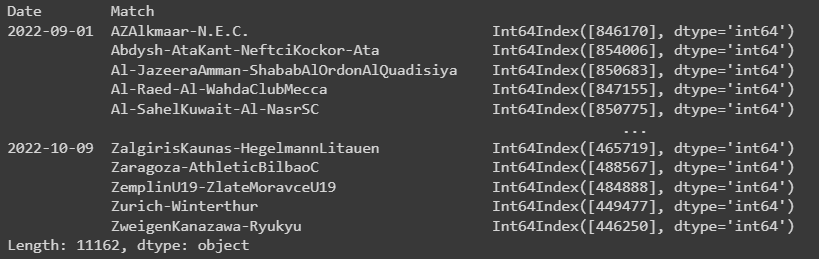 secondhalf_index = df.groupby(['Date','Match']).apply(lambda x: x[(x.M >= 46) & (x.M <= 90)].tail(1).index)