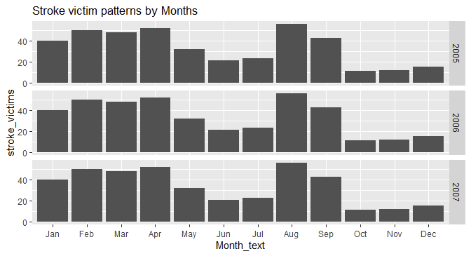 stroke <- structure(list(Year = c(2005L, 2005L, 2005L, 2005L, 2005L, 2005L, 2005L, 2005L, 2005L, 2005L, 2005L, 2005L, 2006L, 2006L, 2006L, 2006L, 2006L, 2006L, 2006L, 2006L, 2006L, 2006L, 2006L, 2006L, 2007L, 2007L, 2007L, 2007L, 2007L, 2007L, 2007L, 2007L, 2007L, 2007L, 2007L, 2007L), Month = c(1L, 2L, 3L, 4L, 5L, 6L, 7L, 8L, 9L, 10L, 11L, 12L, 1L, 2L, 3L, 4L, 5L, 6L, 7L, 8L, 9L, 10L, 11L, 12L, 1L, 2L, 3L, 4L, 5L, 6L, 7L, 8L, 9L, 10L, 11L, 12L), stroke_victims = c(40L, 50L, 48L, 52L, 32L, 21L, 23L, 56L, 43L, 11L, 12L, 15L, 40L, 50L, 48L, 52L, 32L, 21L, 23L, 56L, 43L, 11L, 12L, 15L, 40L, 50L, 48L, 52L, 32L, 21L, 23L, 56L, 43L, 11L, 12L, 15L), Month_text = structure(c(1L, 2L, 3L, 4L, 5L, 6L, 7L, 8L, 9L, 10L, 11L, 12L, 1L, 2L, 3L, 4L, 5L, 6L, 7L, 8L, 9L, 10L, 11L, 12L, 1L, 2L, 3L, 4L, 5L, 6L, 7L, 8L, 9L, 10L, 11L, 12L), .Label = c("Jan", "Feb", "Mar", "Apr", "May", "Jun", "Jul", "Aug", "Sep", "Oct", "Nov", "Dec"), class = "factor")), row.names = c(NA, -36L), class = "data.frame")