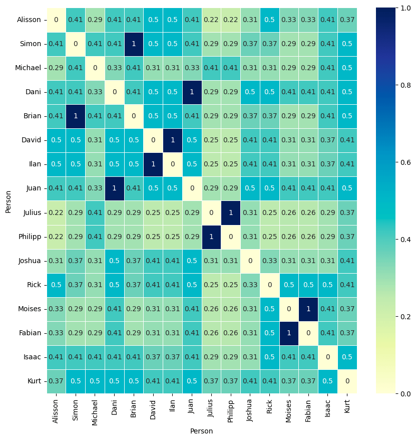 I now would like to create a heatmap which shows how similar this people are to each other. So if two people have in all three variables (GPA,IQ and Salary) three same number, then they get the nnumber 1 in similarity. If they have only two similar numbers in this three variables then they get another color. But I don’t know how can I visualise that.