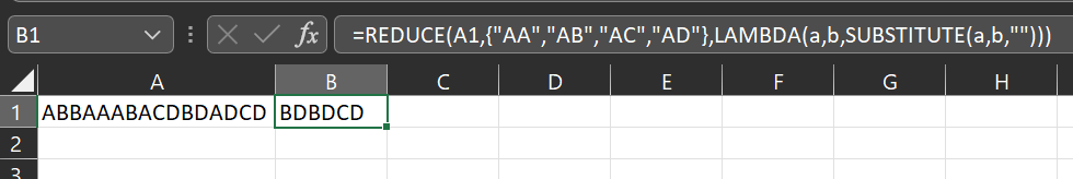 =REDUCE(A1,{"AA","AB","AC","AD"},LAMBDA(a,b,SUBSTITUTE(a,b,"")))