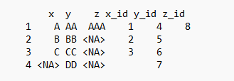 Since there are no NA’s in Column Y, the first row of Column Y is assigned as id = 4 (picks off from the previous row), the second row of Column Y is assigned as id = 5, the third row of Column Y is assigned as id = 6, and the fourth row of Column Y is assigned as id = 7