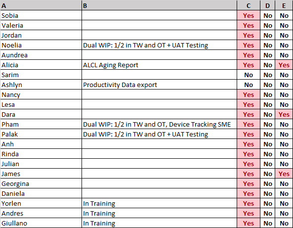 - It takes column A and creates an array of filtered names (autofilter) based off columns C, D, or E
