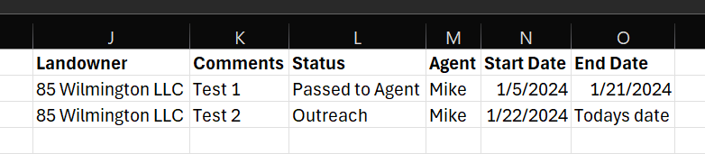 Each record = a landlord with a status column and date that status started. Example: row 1 has landownerA with "Passed to Agent" status on 1/1/24. row 2 has landownerA with "Outreach" status on 1/22/24.