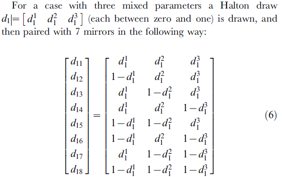 Finally, I would like to create a function that, given a matrix of random numbers, is able to create this expanded matrix of antithetic draws. For example, in the picture below I have a sampling in three dimensions, then the total number of draws per original draw is 2^3 = 8.