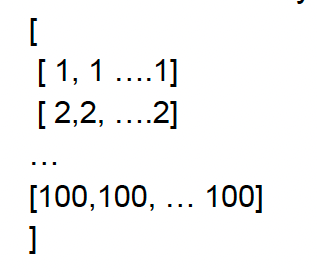 I try to create a matrix 100×100 which should have in each row next ordinal number like below: