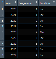 df <- data.frame(Year, Programme, Function)
