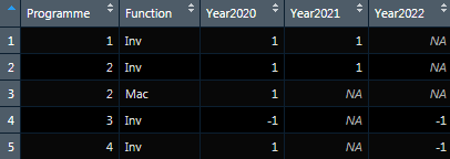 df <- data.frame(Programme, Function, Year2020, Year2021, Year2022)