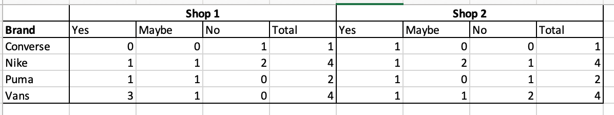 'Shop 2': {0: 'No', 1: 'Yes', 2: 'Maybe', 3: 'Maybe', 4: 'Yes', 5: 'No', 6: 'No', 7: 'No', 8: 'Maybe', 9: 'Yes', 10: 'Yes'}