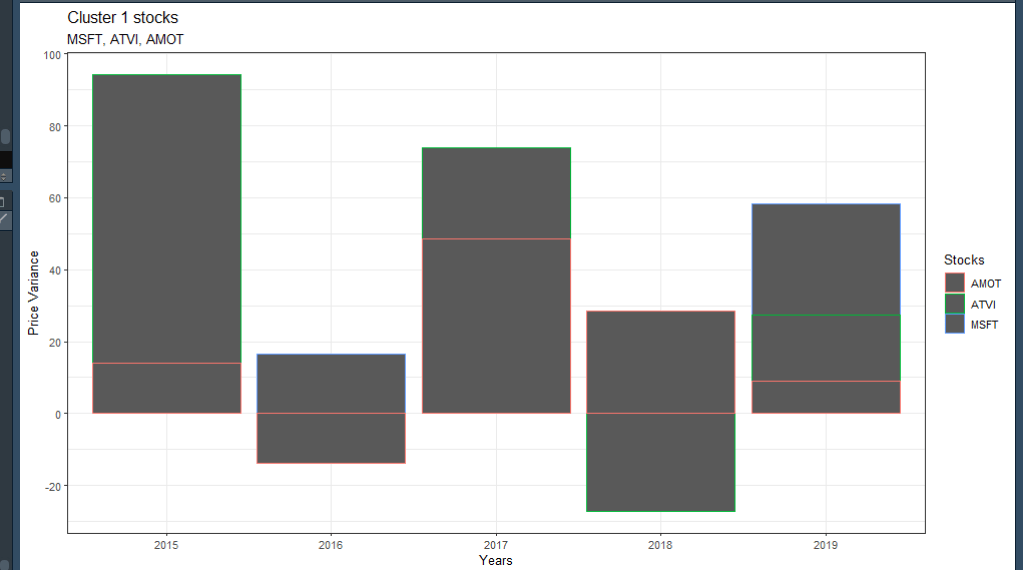 labs(title = "Cluster 1 stocks", subtitle = "MSFT, ATVI, AMOT", colour="Stocks", y= "Price Variance")