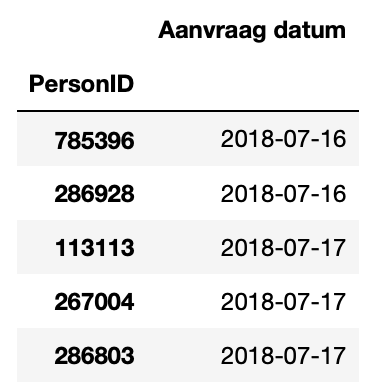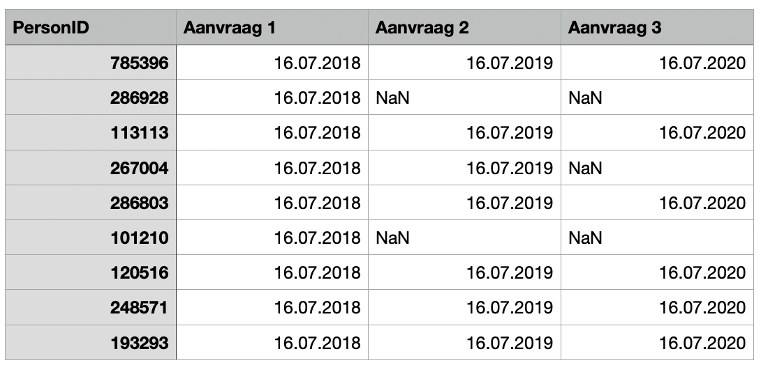 My dataset consists out of two columns, PersonID and Request for application(Aanvraag datum). Some PersonIDs occur multiple times because these persons received multiple request on different dates:
