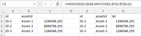 Looks for matching ‘assetid’ (matching table1 and table2) and then returns (from table 2) the ‘lat’ number.