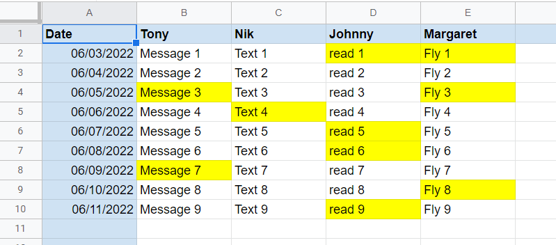 Row 1 with respective names. Range of B2:E has other data with cells highlighted.