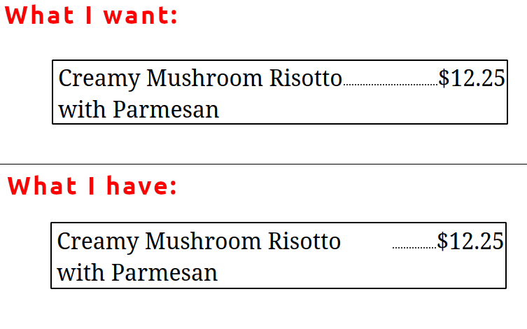 - An item taking the remaining space with a minimum of 10% of the main container (link between dish name and price)