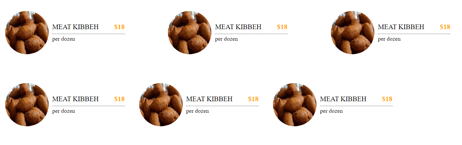 <div><h5 class="menuh5">MEAT KIBBEH <span><b>$18</b></span></h5></div>