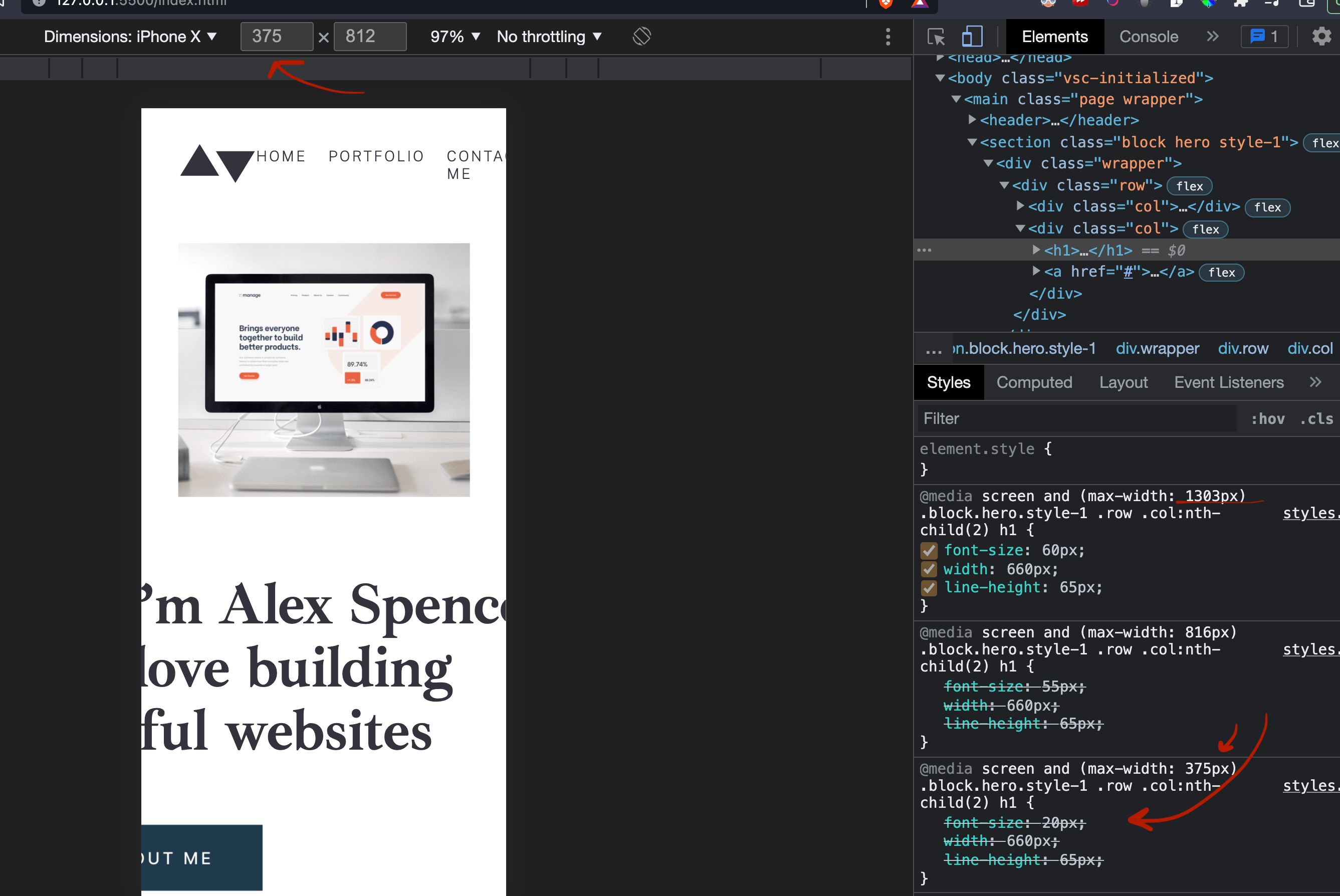 Goal: See the h1 font-size resize when it hits the 375px screen size.