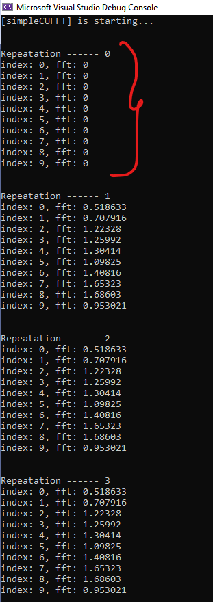 std::cout << "index: " << i << ", fft: " << h_convolved_signal[i].x << std::endl;