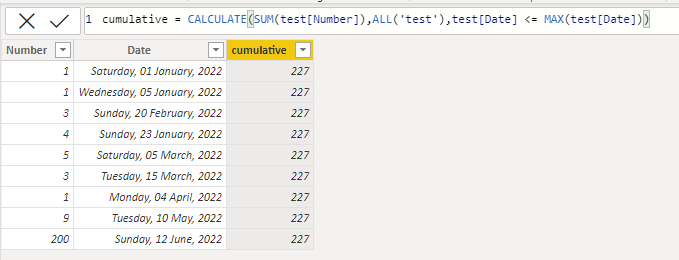 cumulative = CALCULATE(SUM(test[Number]),ALL('test'),test[Date] <= MAX(test[Date]))
