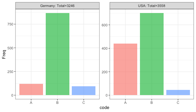 ggplot(DF, aes(code, Freq, fill = code)) + geom_bar(stat = "identity", alpha = 0.7) +