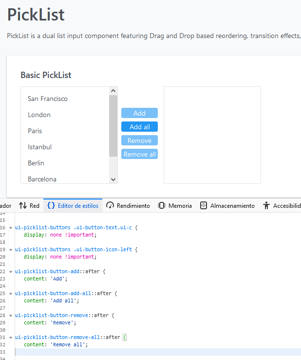 The selection buttons of a picklist appear with icons but in the primefaces documentation I don’t see how they can be changed text or if it is not possible.