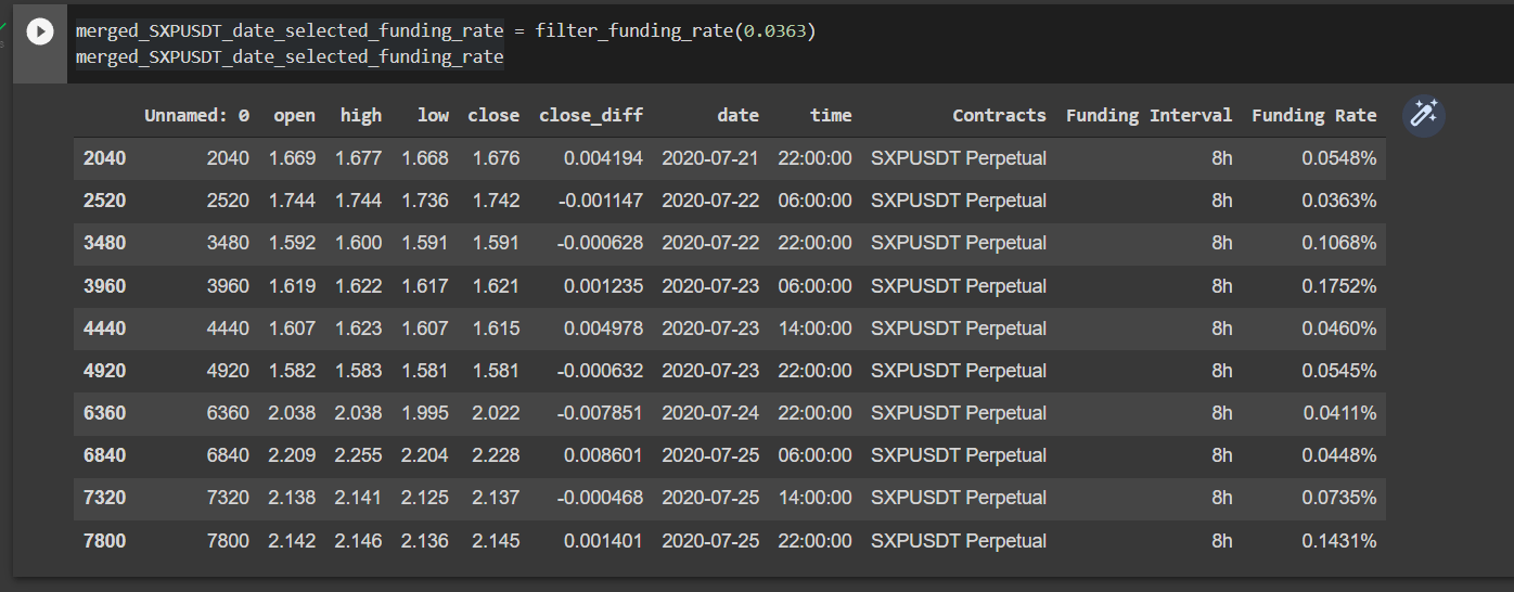 Each time my funding rate is greater than 0.0363 I want that row and the next 3 rows of the matched row.
