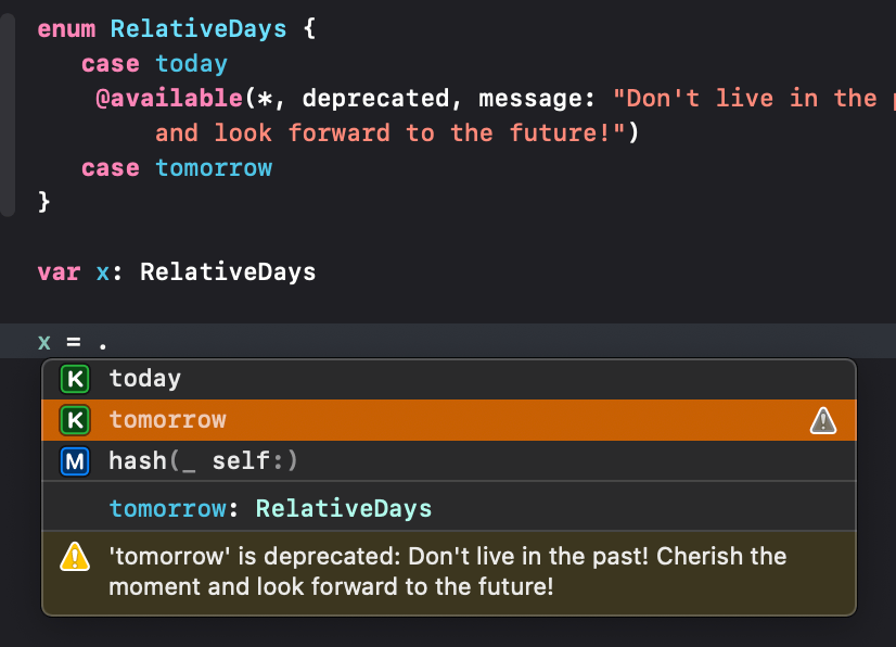 case today, tomorrow, @available(*, deprecated, message: "Don't live in the past! Cherish the moment and look forward to the future!") tomorrow