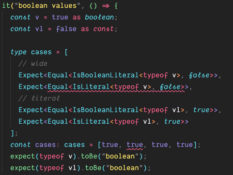 I am running type tests on all of the individual utilities as well as my master blaster IsLiteral and everything works … except I get a false positive for booleans when I test IsLiteral<boolean> and yet IsBooleanLiteral<boolean> works as expected.