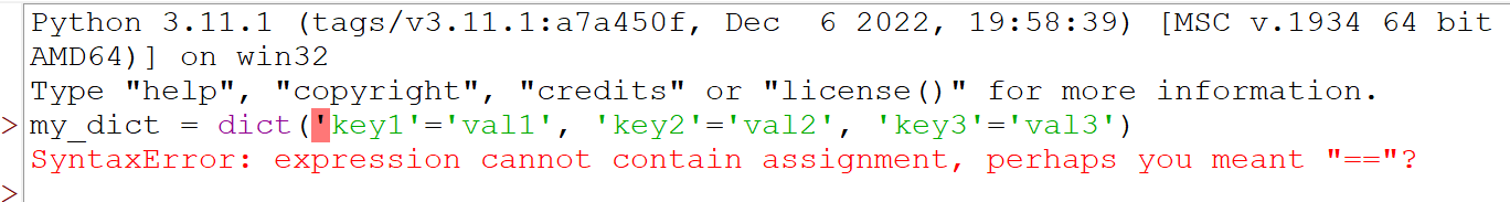 I was exploring different ways to create a dictionary in Python 3 (3.11.1). ChatGPT suggested that I can create a dictionary by using the following syntax:
