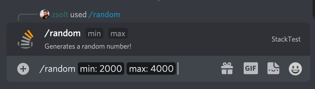 I have this Discord bot here that contains a randomiser command – /random (built with new SlashCommandBuilder) – and consists of two required string options – min and max values.