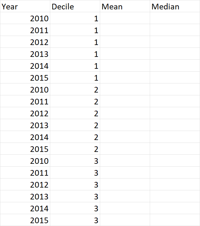 I have tried this but then I have problem calculating the mean and mediam in each year for each decile (not sure this is 100% correct though).