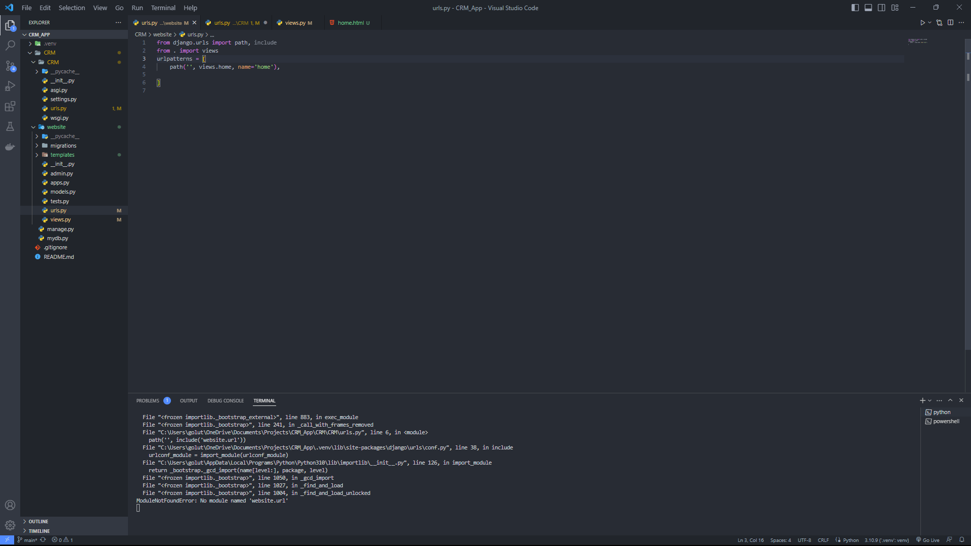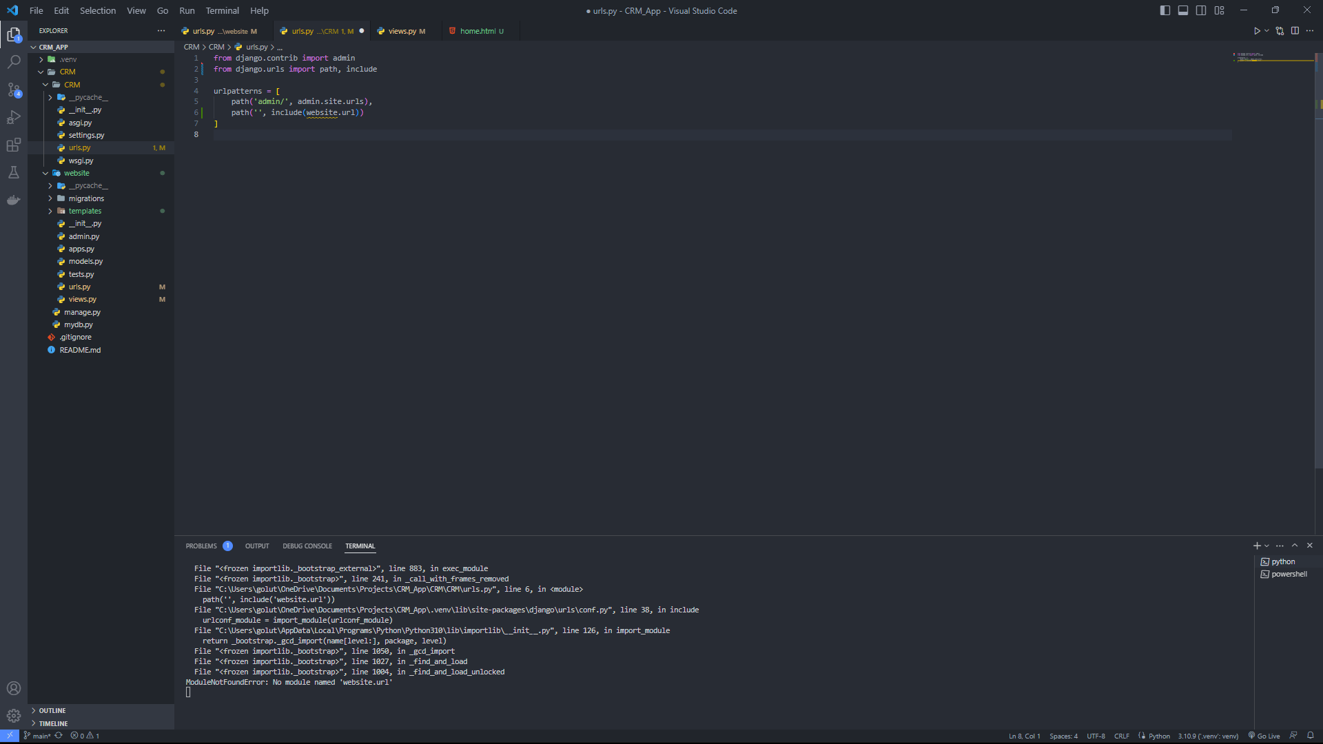 I’m relatively new to python and trying to make a django app. Can someone explain me why I’m running in to this issue with the include statement? The sql server says no module named ‘website’. I think the problem is with the project structure, but I could not understand how to fix it.