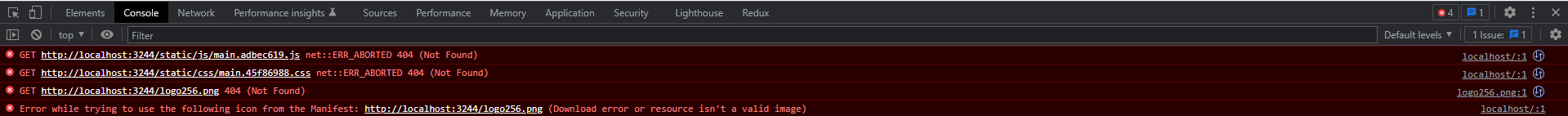 2022/09/28 09:58:46 [error] 11#11: *4 open() "/etc/nginx/html/static/css/main.45f86988.css" failed (2: No such file or directory), client: 172.17.0.1, server: , request: "GET /static/css/main.45f86988.css HTTP/1.1", host: "localhost:3244", referrer: "http://localhost:3244/"