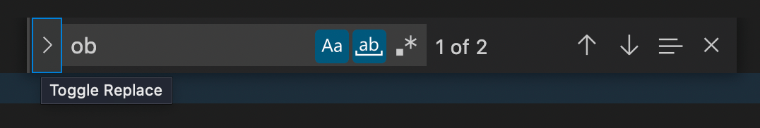 Visual Studio Code has a search and replace widget with a little dropdown button that toggles between one-line search mode and two-line replace mode. If you hover the pointer over it there’s a tooltop saying "Toggle Replace".