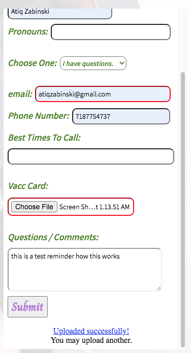The form fields and their answers remain in place, and below them appears the message "Uploaded successfully! You may upload another." What I want to have happen, besides a message like this appearing, is for all form fields and their answers disappear except for the Vacc Card/Choose File and Submit buttons.