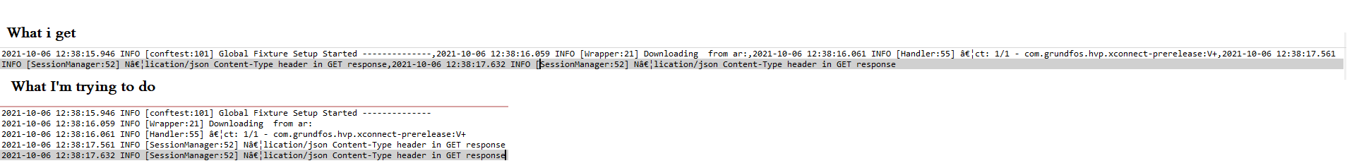 var text = ['2021-10-06 12:38:15.946 INFO [conftest:101] Global Fixture Setup Started --------------', '2021-10-06 12:38:16.059 INFO [Wrapper:21] Downloading from ar:', '2021-10-06 12:38:16.061 INFO [Handler:55] …ct: 1/1 - com.grundfos.hvp.xconnect-prerelease:V+', '2021-10-06 12:38:17.561 INFO [SessionManager:52] N…lication/json Content-Type header in GET response', '2021-10-06 12:38:17.632 INFO [SessionManager:52] N…lication/json Content-Type header in GET response'];