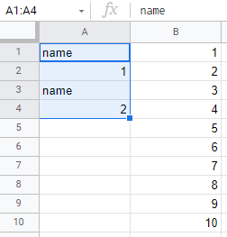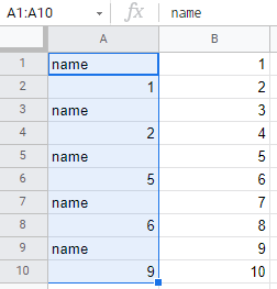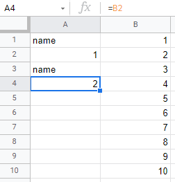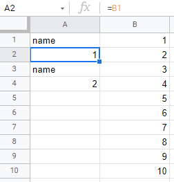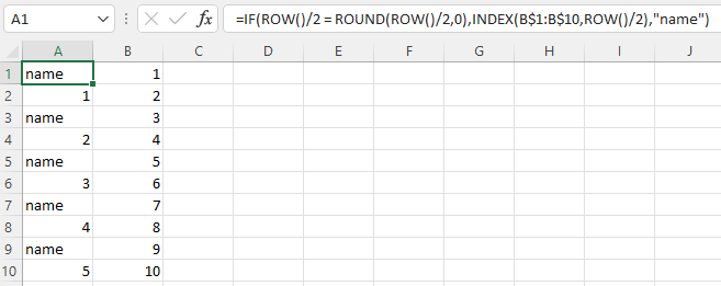 =IF(ROW()/2 = ROUND(ROW()/2,0),INDEX(B$1:B$10,ROW()/2),"name")